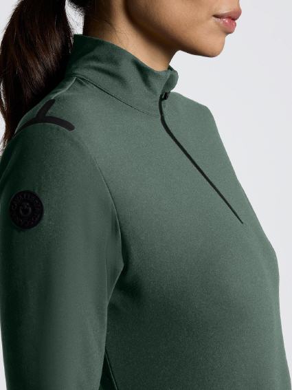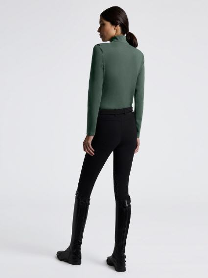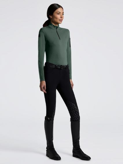 Das Cavalleria Toscana Damen Langarm-Trainings-Poloshirt aus Fleece-Jersey mit Rollkragen wurde entwickelt, um thermischen Komfort und volle Bewegungsfreiheit beim Fahren oder bei Outdoor-Aktivitäten zu bieten. Das technische Fleece-Jersey-Material sorgt für leichte Isolierung und Atmungsaktivität, während der halbe Reißverschluss und der Rollkragen Windschutz bieten, ohne Kompromisse beim Stil einzugehen. Es verfügt über heißversiegelte Details und eine Seitentasche mit versiegeltem Reißverschluss und ist mit dem Cavalleria Toscana-Silikonlogo auf dem Ärmel versehen. Ein leistungsorientiertes Poloshirt mit kühnem Design – ideal für den modernen Reiter.