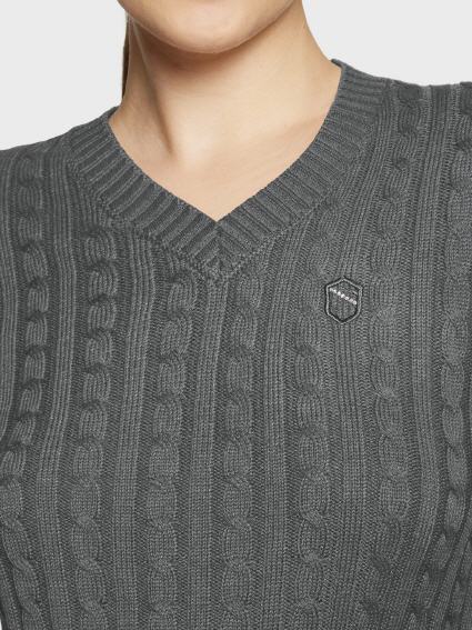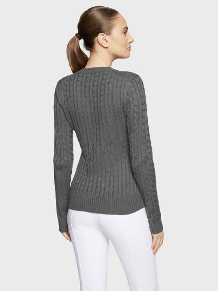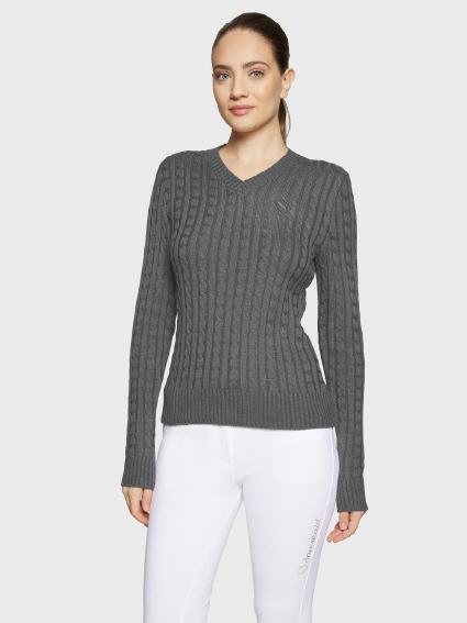 Lisa Twisted Damenpullover von Samshield. Ideal für Frauen, die einen schlichten und eleganten Stil mit einem Hauch von Zopfstrickkristallen suchen. Mit V-Ausschnitt und gesticktem Samshield-Wappen mit Kristallverzierungen auf der Vorderseite.