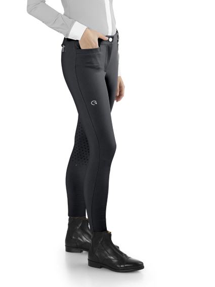 Die Damenreithose von Ego7 ist aus funktionalem Gewebe, einer Materialkombination aus Polyamid und Elasthan gefertigt und damit besonders angenehm zu tragen. Der 4-Wege-Stretch sorgt für eine optimale Passform, sowie genügend Bewegungsfreiheit beim Reiten. Diese Damenreithose bietet durch den speziellen Kniebesatz, welcher dekorativ mit dem EGO7 Logo versehen ist, einen besonders guten Halt im Sattel. Auf der Bundinnenseite ist ein Grip angebracht, welcher ein Verrutschen des Shirts verhindert. Vorne zwei Einschubtaschen, die Gesäßtaschen sind mit praktischen Reißverschlüssen versehen.