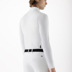 Aus recyceltem Nylonstoff mit 4-Wege-Stretch gefertigt, bietet diese ungefütterte Equiline Herren Turnierjacke Atmungsaktivität und Flexibilität für eine makellose Passform. Schwarze Details an Kragen und Taschen setzen klassische Kontraste, während UPF 15+ Sonnenschutz und schnelltrocknende Technologie für angenehmen Komfort sorgen. Airbag-Westen-kompatibel, wurde sie entwickelt, um Stil und Sicherheit zu vereinen.