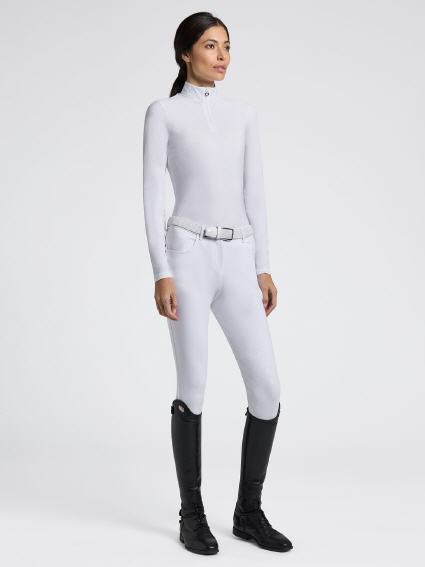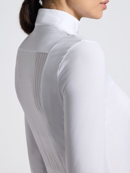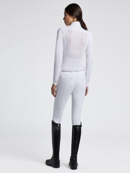 Das langärmelige Turniershirt für Damen in warmem Trikot mit Jacquard-Einsatz wurde entwickelt, um Komfort, Eleganz und Leistung bei Wettkämpfen in der kälteren Jahreszeit zu bieten. Der weiche, warme Jersey sorgt für eine hervorragende Wärmeisolierung und Atmungsaktivität, während der Rückeneinsatz aus Jacquardgewebe für Textur und eine raffinierte Ästhetik sorgt. Der weiße Popeline-Kragen bietet einen cleanen und traditionellen Look, der durch das heiß applizierte, gestickte Cavalleria Toscana-Logo am Hals unterstrichen wird. Ideal für junge Reiterinnen die ein technisches und elegantes Shirt für Winterwettkämpfe suchen.