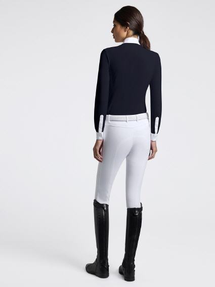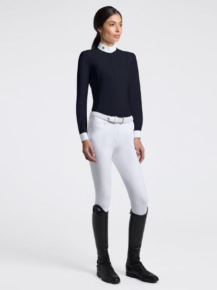 Das Cavalleria Toscana Damen Langarm-Wettkampfshirt mit Laser-Cut-Einsätzen wurde entwickelt, um Komfort, Atmungsaktivität und raffinierte Eleganz bei jedem Wettkampf zu bieten. Er ist aus technischem Stretch-Jersey gefertigt, passt sich perfekt an die Silhouette an und sorgt gleichzeitig für maximale Bewegungsfreiheit. Der strahlend weiße Popeline-Kragen und die versteckten Knöpfe bewahren eine klare, formale Ästhetik. Lasergeschnittene Details an den Seiten sorgen für einen modernen, raffinierten Touch und verbessern gleichzeitig die Belüftung während der Aktivität. Dieses Hemd ist mit dem gestickten Cavalleria Toscana-Logo auf der Brust versehen und die ideale Wahl für Fahrer, die auf der Suche nach Hochleistungsausrüstung mit der charakteristischen Eleganz der Marke sind.