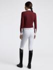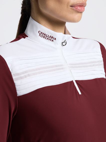 Das Cavalleria Toscana Damen Langarm-Wettkampfshirt mit plissiertem Einsatz wurde entwickelt, um raffinierten Stil und technische Funktionalität im Wettkampf zu kombinieren. Er ist aus technischem Stretch-Jersey gefertigt und sorgt für optimalen Komfort und Bewegungsfreiheit, während der Kragen und die Manschetten aus weißem Popeline für einen sauberen, formellen Look sorgen. Das herausragende Merkmal ist der zentrale plissierte Einsatz mit einem freiliegenden, heißversiegelten Frontreißverschluss und einem personalisierten Zipper der einen modernen Touch verleiht, ohne die Eleganz zu beeinträchtigen. Dieses Shirt ist mit dem gestickten Cavalleria Toscana-Logo am Kragen versehen und eignet sich ideal für Reiter, die ein leistungsstarkes Kleidungsstück mit raffinierten Details suchen.