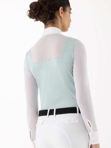 Für Anmut und Leistung entworfen, kombiniert dieses Langarmshirt atmungsaktives, elastisches Material mit Kühltechnologie, um Sie während der gesamten Reitstunde frisch zu halten. Weißer Stretch-Tüll an Ärmeln und Rücken sorgt für dezente Eleganz und Belüftung, während verdeckte Knöpfe auf der Vorderseite einen klaren Look bewahren. Abgerundet wird das Design durch schnelltrocknende Eigenschaften, UPF 30+ Sonnenschutz, weiße Druckknöpfe an Kragen und Manschetten sowie ein weißes, aufgedrucktes Logo auf der Brust – die perfekte Kombination aus Stil und Funktion.