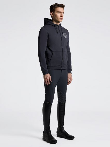Unverzichtbar für Komfort und Stil ist dieser Cavalleria Toscana Kapuzenpullover perfekt für Entspannung oder Freizeitkleidung. Aus weichem Baumwollfleece gefertigt, spendet es den ganzen Tag über Wärme und ein angenehmes Gefühl. Das klassische Design verfügt über einen durchgehenden zentralen Reißverschluss für Praktikabilität und Kängurutaschen, um die Hände warm zu halten. Die Kapuze ist mit einem Kordel verstellbar. Das herausragende Detail ist die große, runde Stickerei, die das CT-Logo auf der Brust einrahmt, gefertigt mit hochwertigen Techniken, die das Kleidungsstück aufwerten. Ein gummierter CT-Logo-Reißverschluss vervollständigt den funktionalen Stil. Ideal für jeden Reitsportbegeisterten.