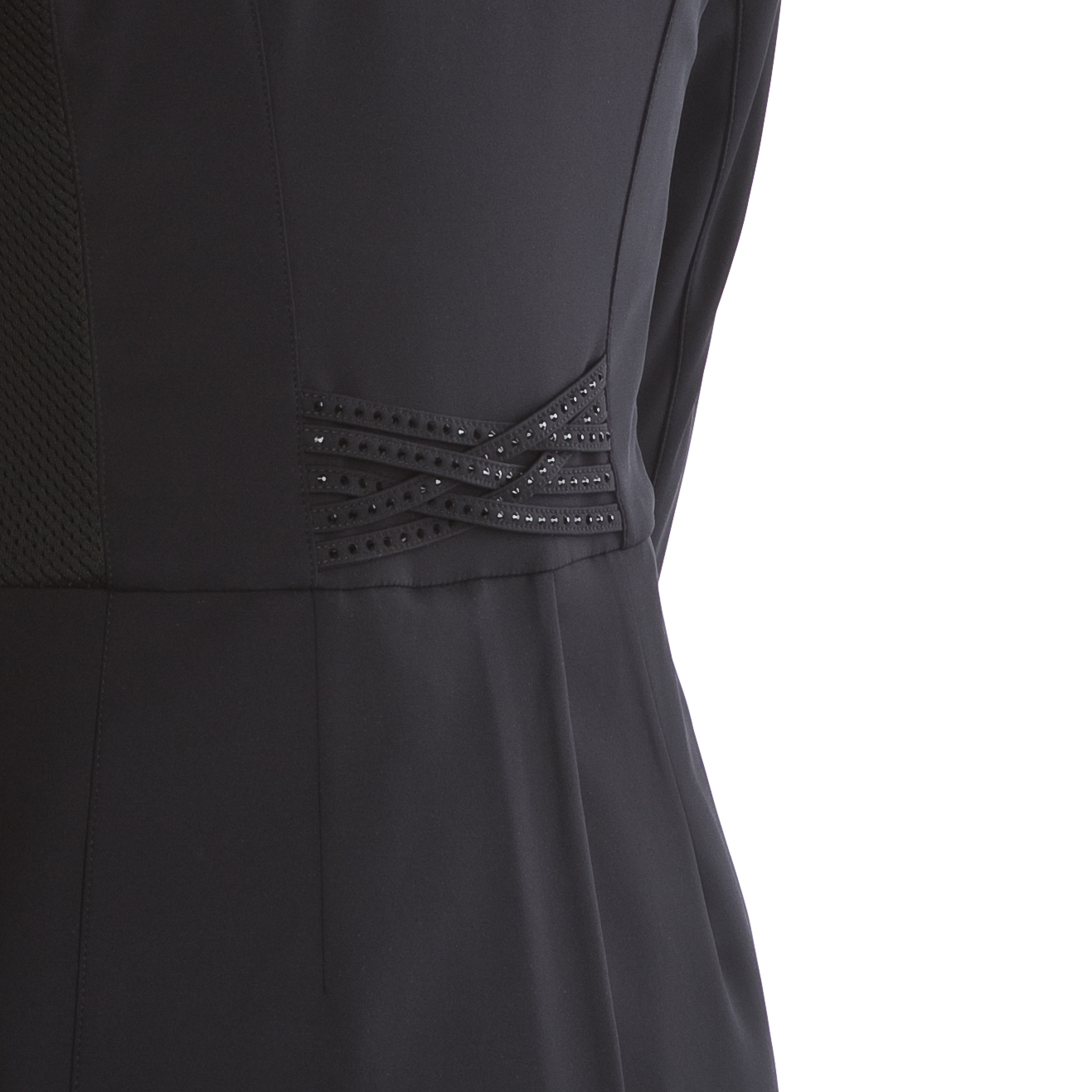 Verzierung mit kleinen Ton-in-Ton Strass-Steinchen an Kragen und Schoß.