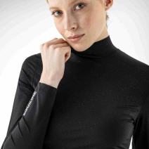 Diese Glitzer-Second Skin für Damen ist außergewöhnlich komfortabel und atmungsaktiv. Aus silberschwarzem Stretch-Gewebe gefertigt, sitzt sie bequem und geschmeidig, und ist außerdem schnell trocknend. Das silberne, auf den Ärmel aufgedruckte Equiline-Logo kombiniert Funktionalität mit einem Hauch von Eleganz.