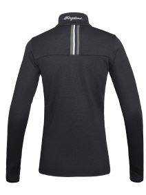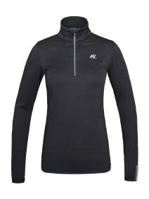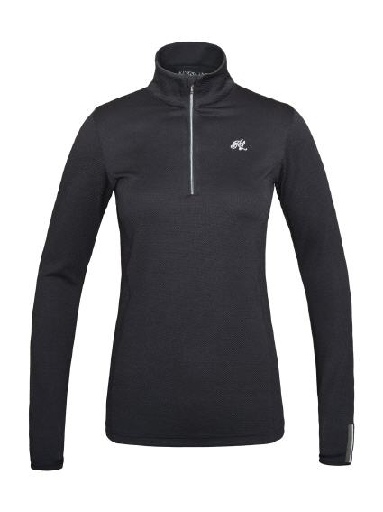 Sportlich elegantes Damen Trainingsshirt aus atmungsaktivem Material, welches für eine optimale Luftzirkulation sorgt und kühl und trocken hält. Kurzer Reißverschluss vorn, Zipper mit kleinen Kristallen. Elastisches Band mit Lurex am Ärmel,