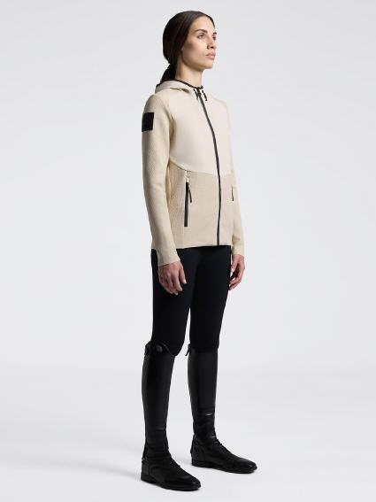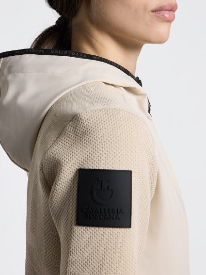 Diese Cavalleria Toscana Softshell-Jacke ist der perfekte Verbündeten bei schlechtem Wetter und verbindet raffinierte Ästhetik mit hoher Leistung. Hergestellt aus hochstrapazierfähigem, wasserabweisendem Extreme Jacquard Technical Fabric bietet es Schutz vor Wind und Regen, ohne die Atmungsaktivität zu beeinträchtigen. Das zweifarbige Design mit Seiten- und Ärmeleinlagen schafft eine moderne Silhouette, während die mikroartige Jacquard-Textur Tiefe verleiht. Die Reißverschlüsse sind gummiiert und wasserdicht, sodass Ihre Sachen trocken bleiben. Die ergonomische Kapuze und die elastischen Manschetten sorgen für eine optimale Passform. Ideal zum Reiten und Outdoor-Aktivitäten.
