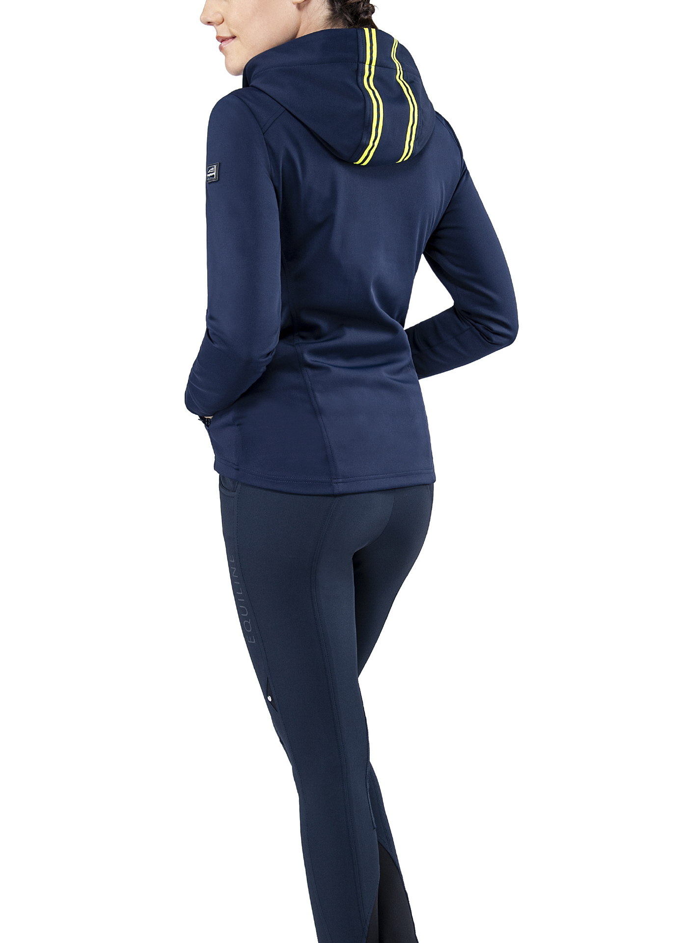 Sportiver Look mit gelben Zierstreifen an den Ärmeln und an der Kapuze.