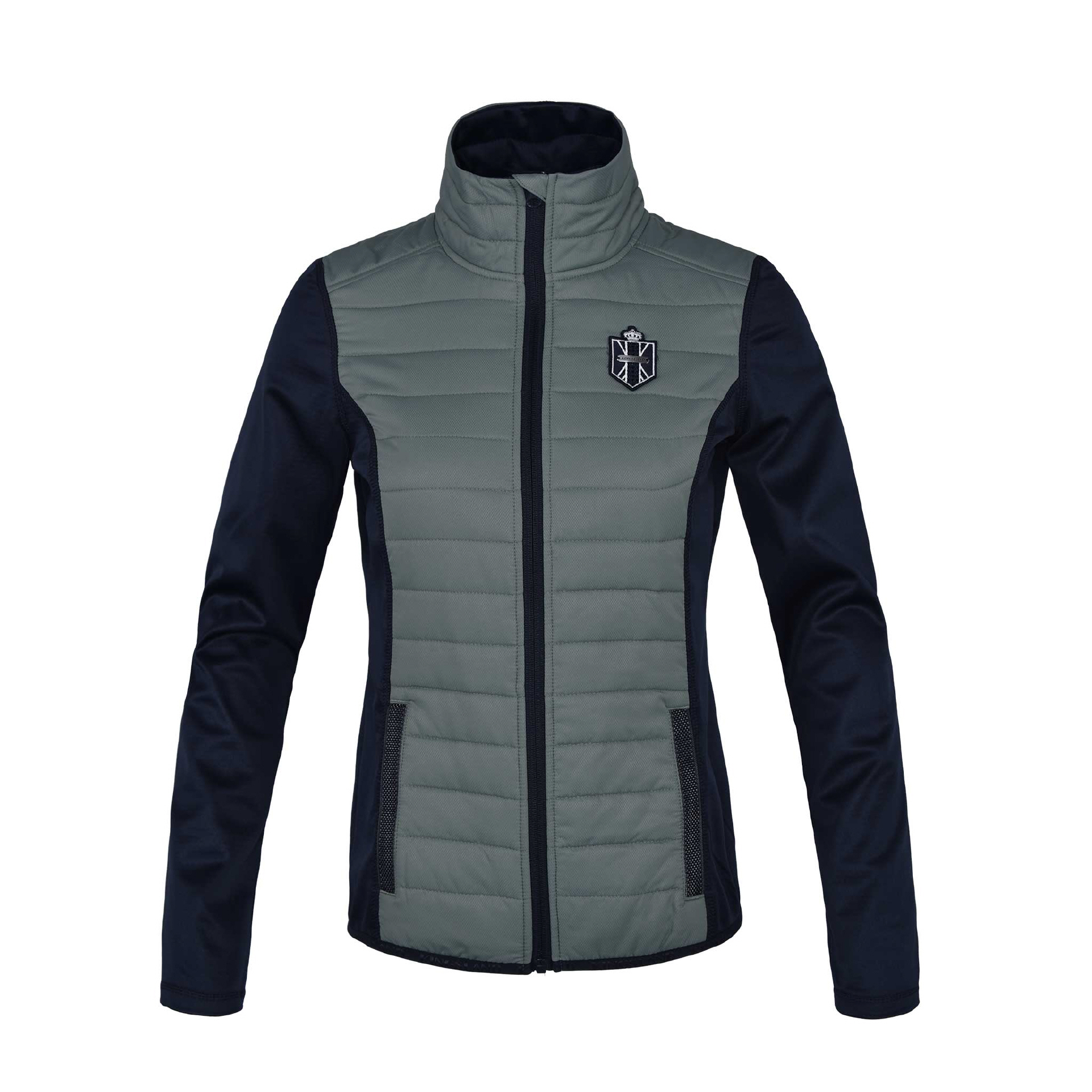 Softshelljacke mit isoliertem Frontbereich und in den Einsätzen am Rücken. Glänzendes Band an den zwei Reißverschlusstaschen und an der Kragenrückseite. Paillettenaufnäher auf der Brust.