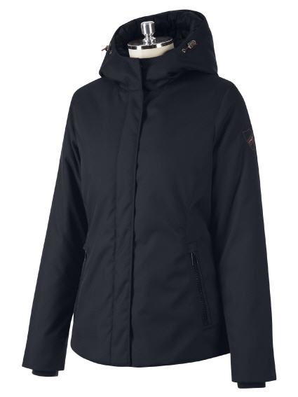 Warme, länger geschnittene Damen Winterjacke von ANIMO mit hohem Kragen und Kapuze.