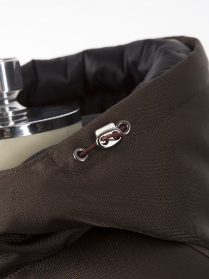 Kapuze mit Kordelzug zur Weitenregulierung, mit Druckknopf am Rücken zu befestigen.
