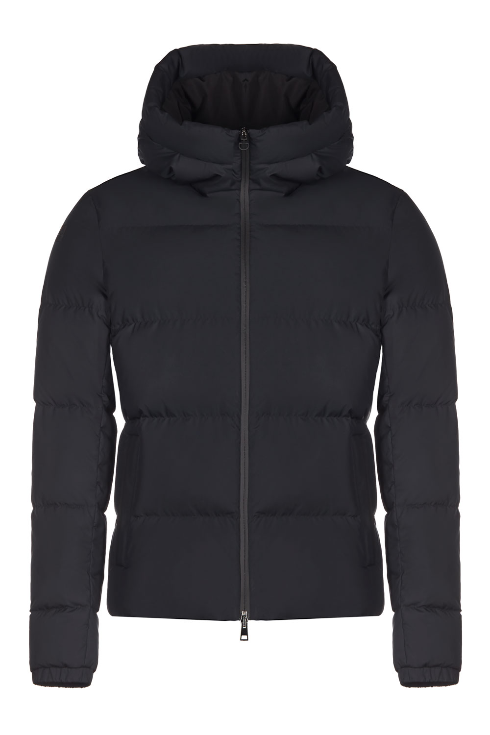 Warme, gesteppte Herren Daunenjacke mit Kapuze, die mit Druckknopf am Rücken fixiert werden kann.