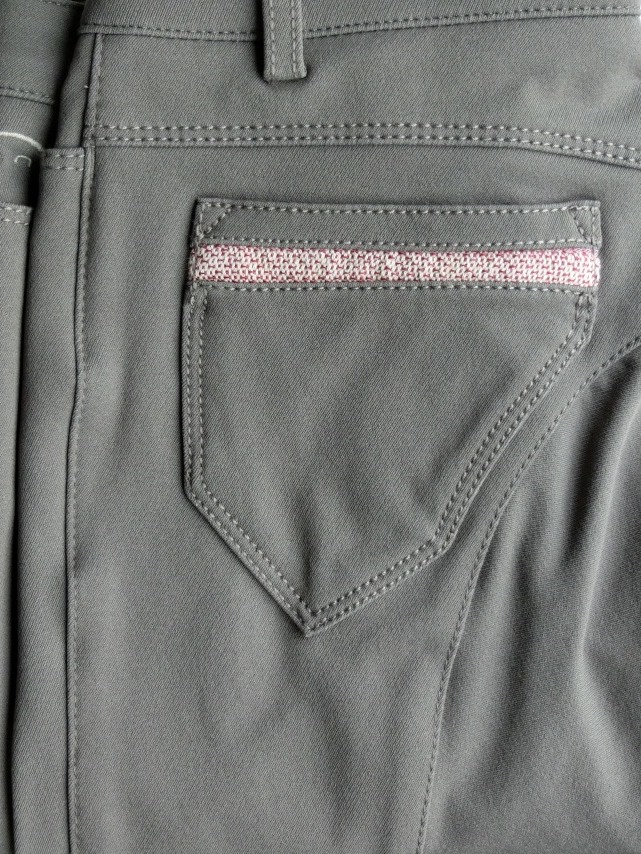 Farbiger Strickeinsatz an der Gesäßtasche.