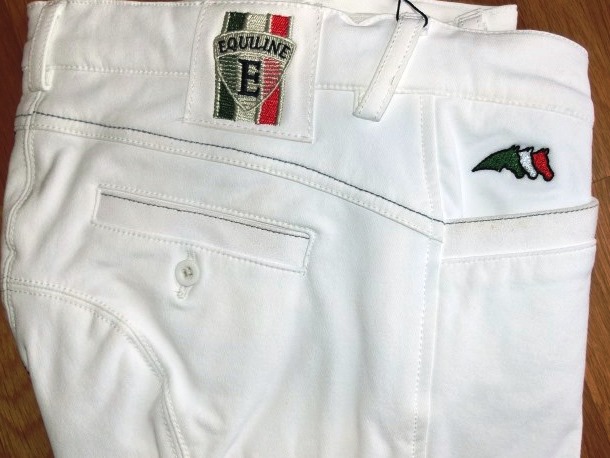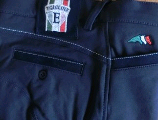 EQ-ItalyFlag am Bund hinten.EQUILINE-Logo auf einem Oberschenkel.