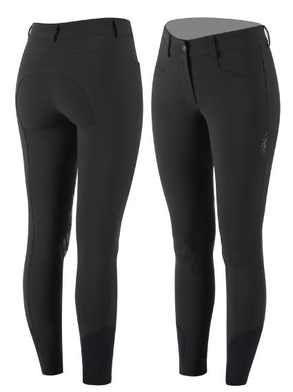 Damen Kniegrip Reithose aus dem leichten und blickdichtem Material "NEXT". Der Kniegrip gibt einen sicheren Halt im Sattel und die nahtlose Verarbeitung im Bereich der Knie verhindert Druckstellen. Das Material NEXT ist super elastisch, atmungsaktiv und schnel ltrocknend und somit ideal für den Reitsport geeignet, da man in seiner Bewegungsfreiheit nicht eingeschränkt ist. Optisch überzeugt diese Reithose mit den farblich abgesetzten Beinabschlüssen und dem ANIMO Strasslogo am linken Oberschenkel. Diese Reithose wird von ANIMO direkt in Italien geschneidert.