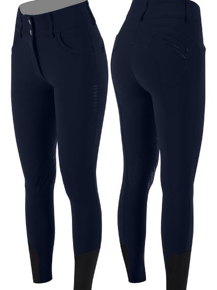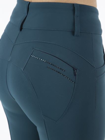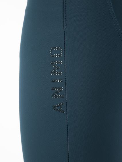 Animo Damen Reithose mit hoher Taille und Kniebesatz und elastischem Beinabschluss. Animo-Logo auf der Oberschenkelaußenseite und Design auf den Gesäßtaschen – beide aus Strasssteinen.