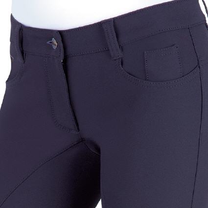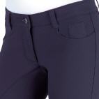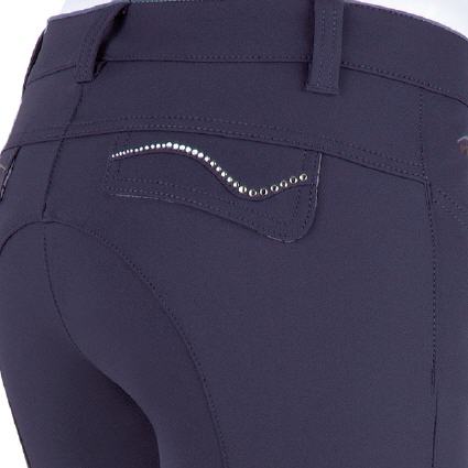 Die Applikation aus Nieten und Swarowski-Strass an den angedeuteten Tasche hinten wertet das Modell modisch auf.