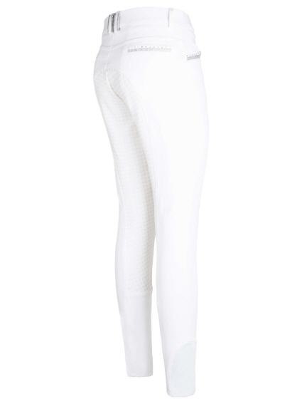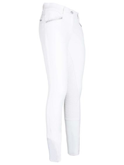 Schicke feminine Vollbesatz Reithose mit Glitzerakzenten. Die im klassischen four-pocket Stil gefertigte Reithose El Capone mit Vollbesatz aus Silikon bietet perfekten Reit-Komfort und ist ein echter Hingucker; dafür sorgen die mit Strasssteinen und Glitzer-Applikationen verzierten Vorder- und Hintertaschen, die zwei ebenfalls mit Glitzerfoliendruck verzierten hinteren Gürtelschlaufen sowie der im farblichen Kontrast gehaltene Silikonbesatz im Beans Design. Ein Logo in Glitzerfoliendruck ist am Vorderbein aufgebracht. Auf dem Bund befindet sich ein Knopf mit geprägtem IR Logo. Die hochwertig verarbeiteten, farblich kontrastierenden Beinenden sind elastisch.