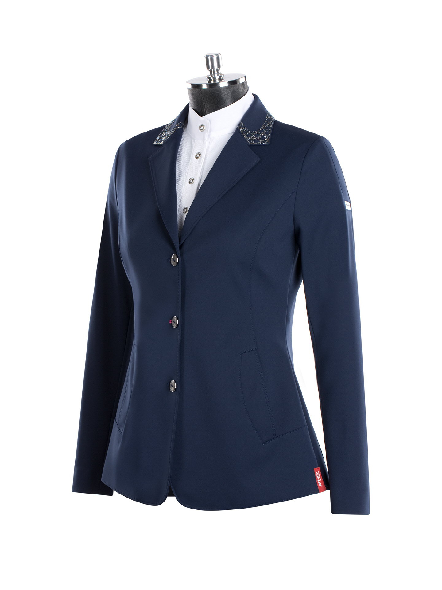 ANIMO Damen Reitjacket mit aufwändiger Verzierung mit farbigen größeren und kleineren Strass-Steinchen am Kragen.