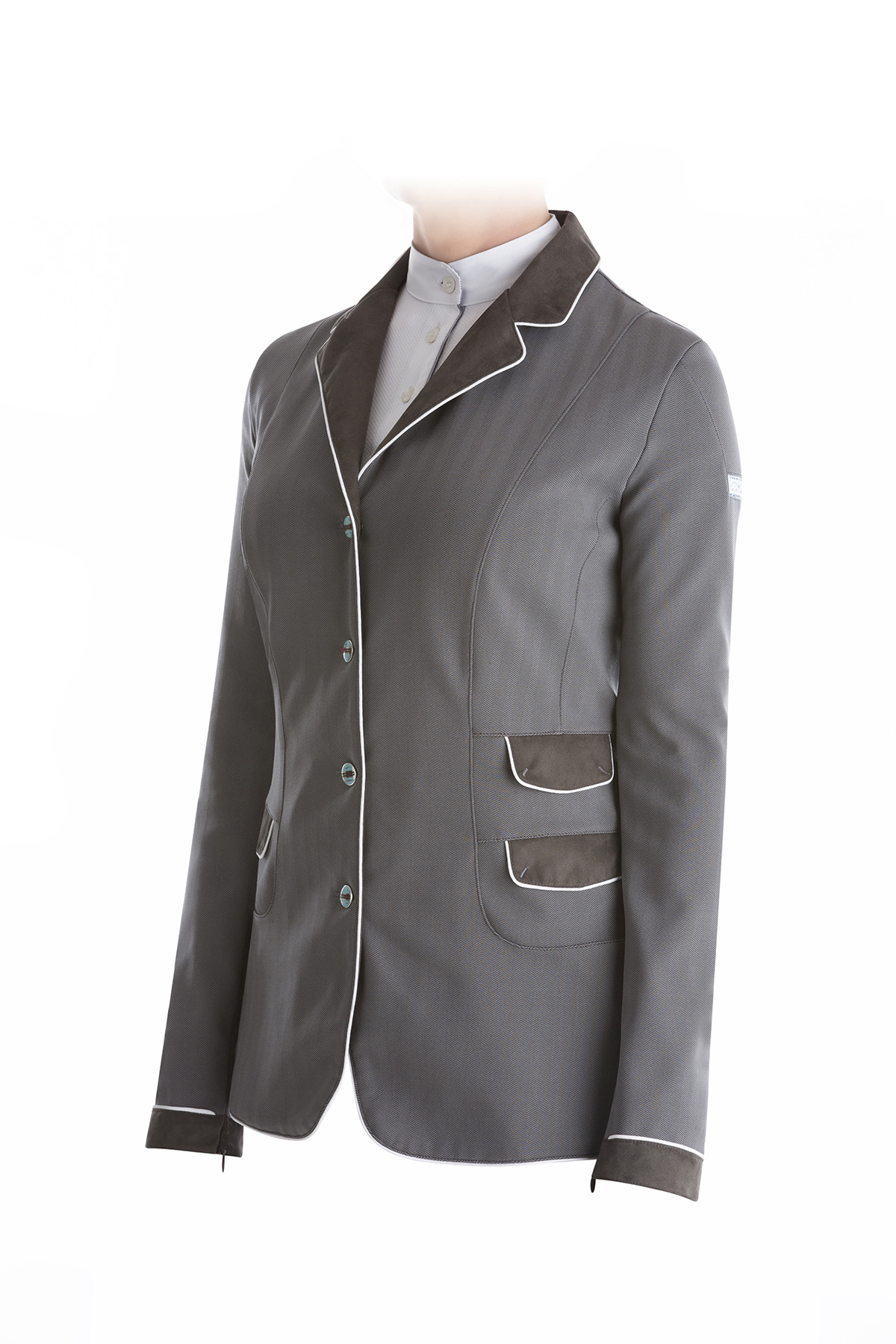 Damen Reitjacket von ANIMO mit Fischgrätmuster. Klapptaschen und Kragen in Alcantara Optik.