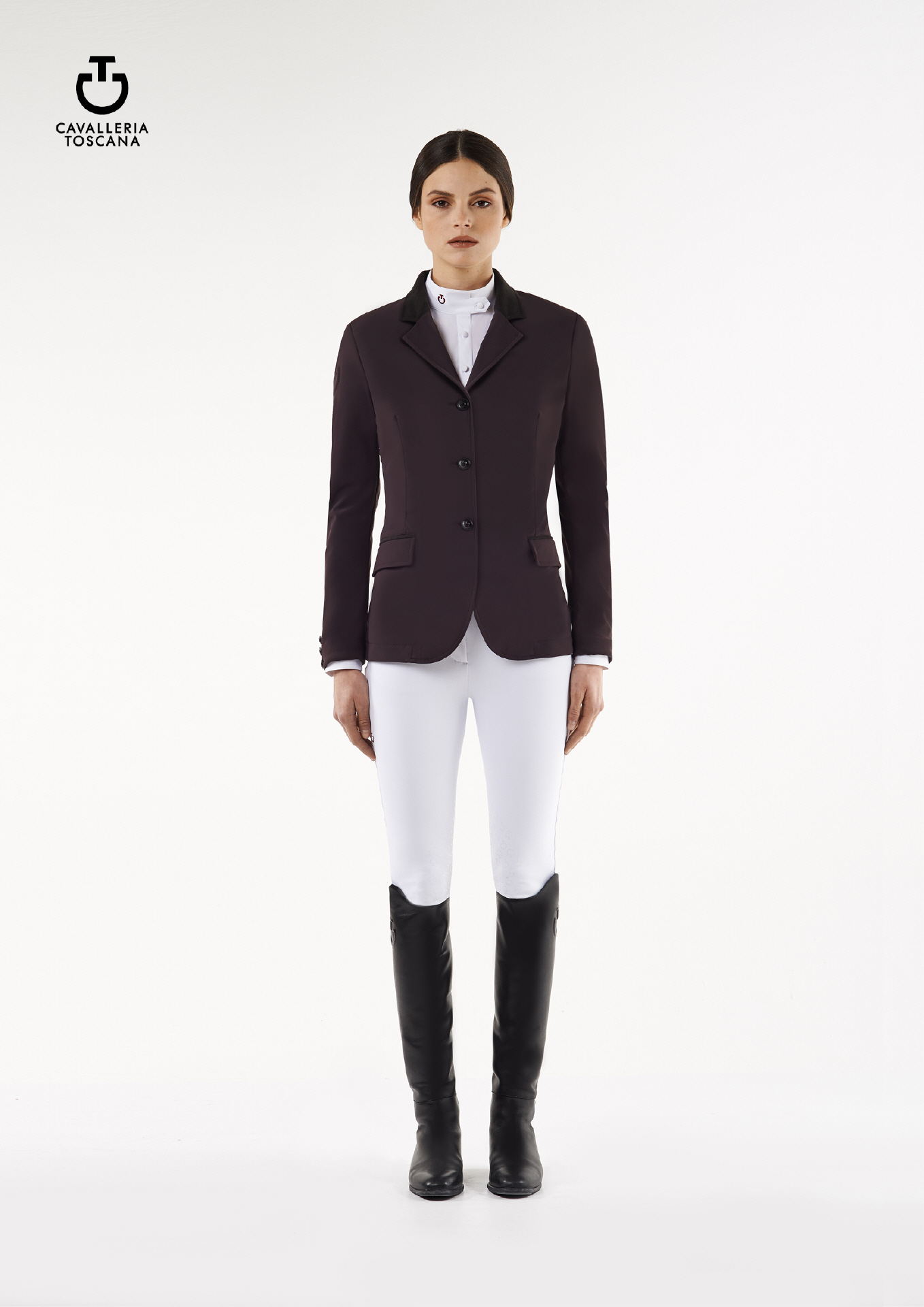 Klassisches Damen Reitjacket von CAVALLERIA TOSCANA mit schwarzem Kragen in Alcantara Optik.