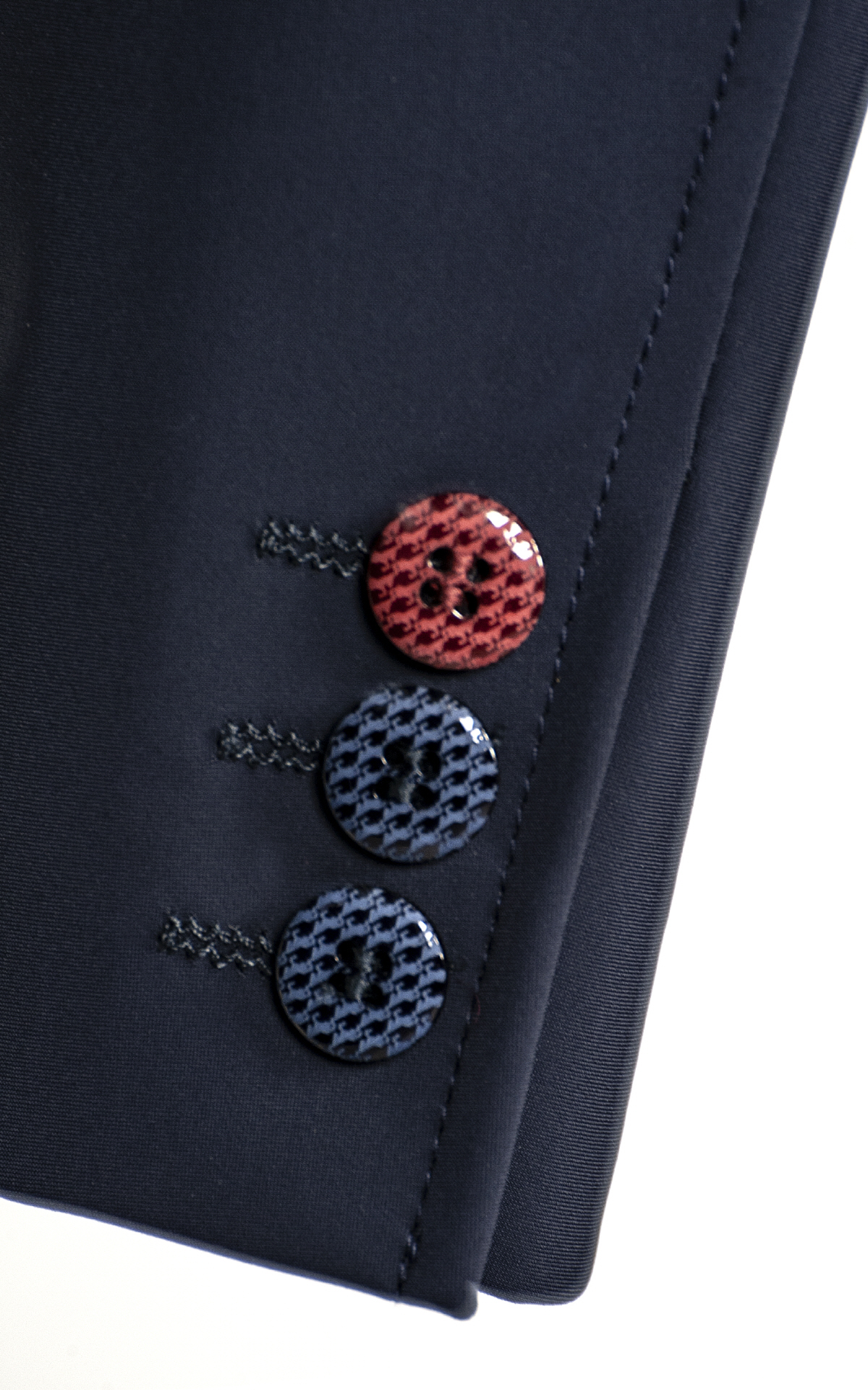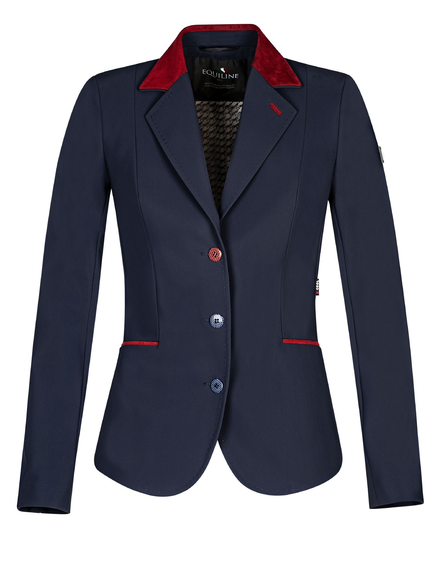 Mit speziellen farbigen Knöpfe. Exclusiv bedrucktes Innenfutter, Luft-Ösen unter den Armen, Equiline Metallogo auf dem Ärmel.