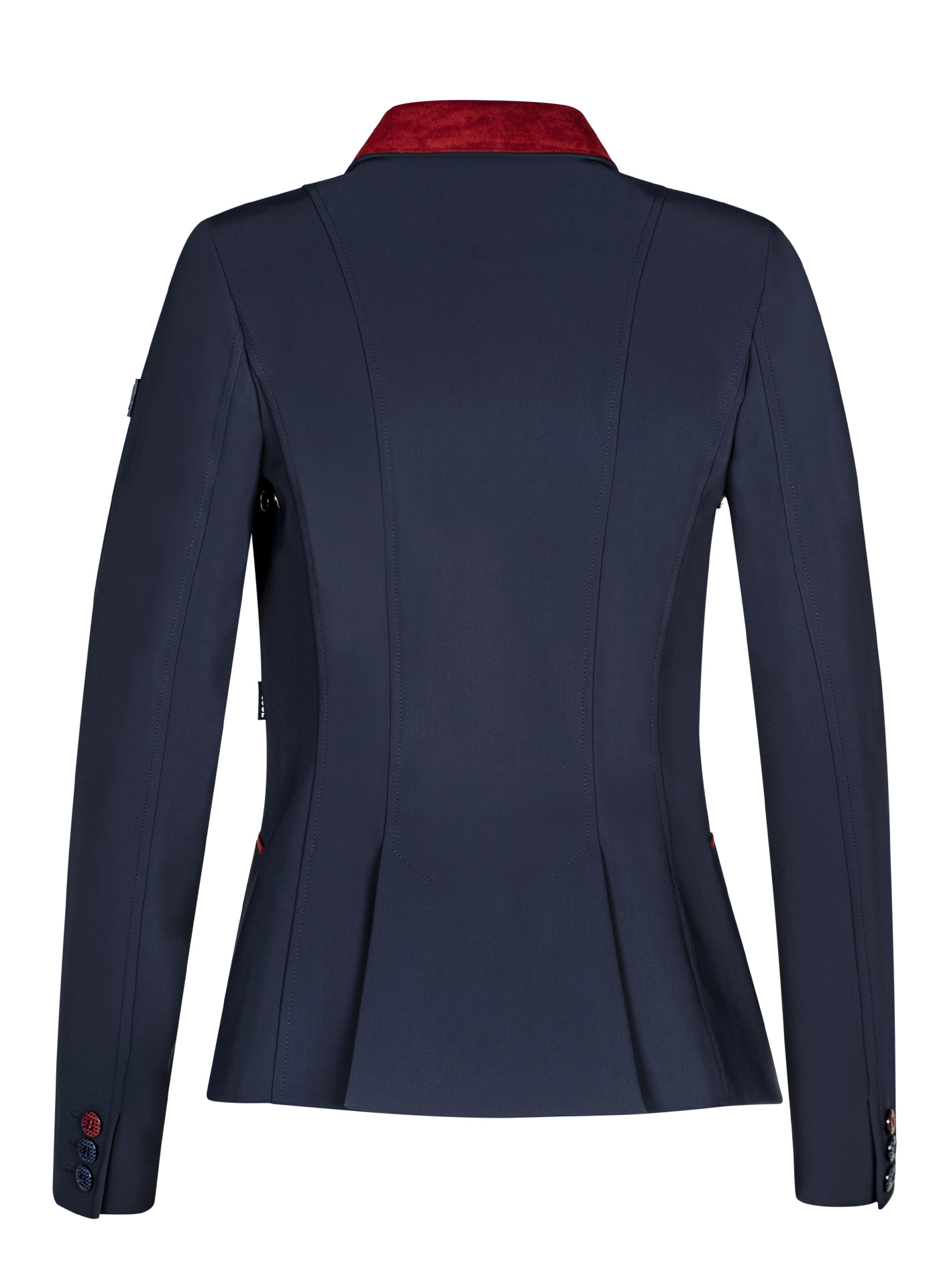 Atmungsaktives und elastisches X-Cool Reitjacket von EQUILINE mit bordeaux-farbenen Wildleder Details an Kragen und Taschen.