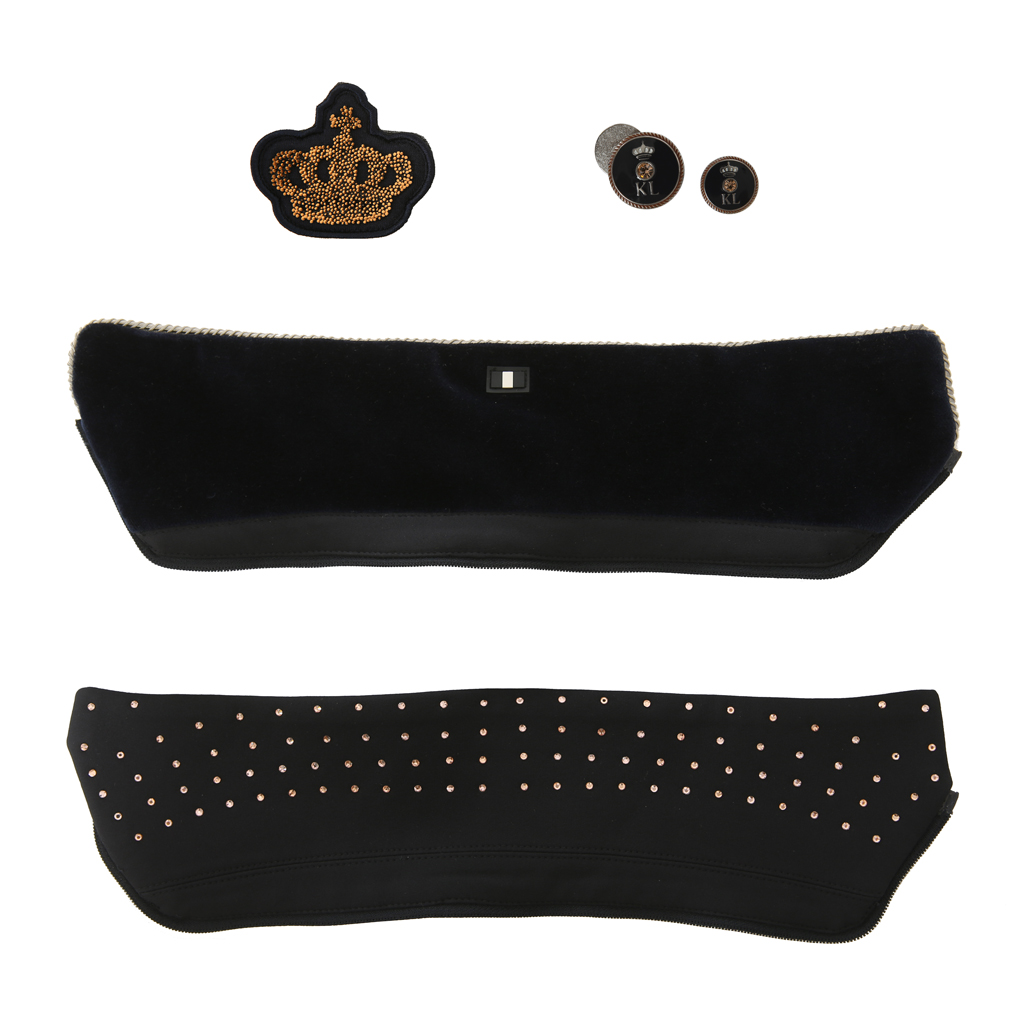 – navy-/silberfarbene Knöpfe mit Markendetails, Kragen mit navyfarbenen Glitzersteinchen und einem silbernen Kronenaufnäher besetzt.