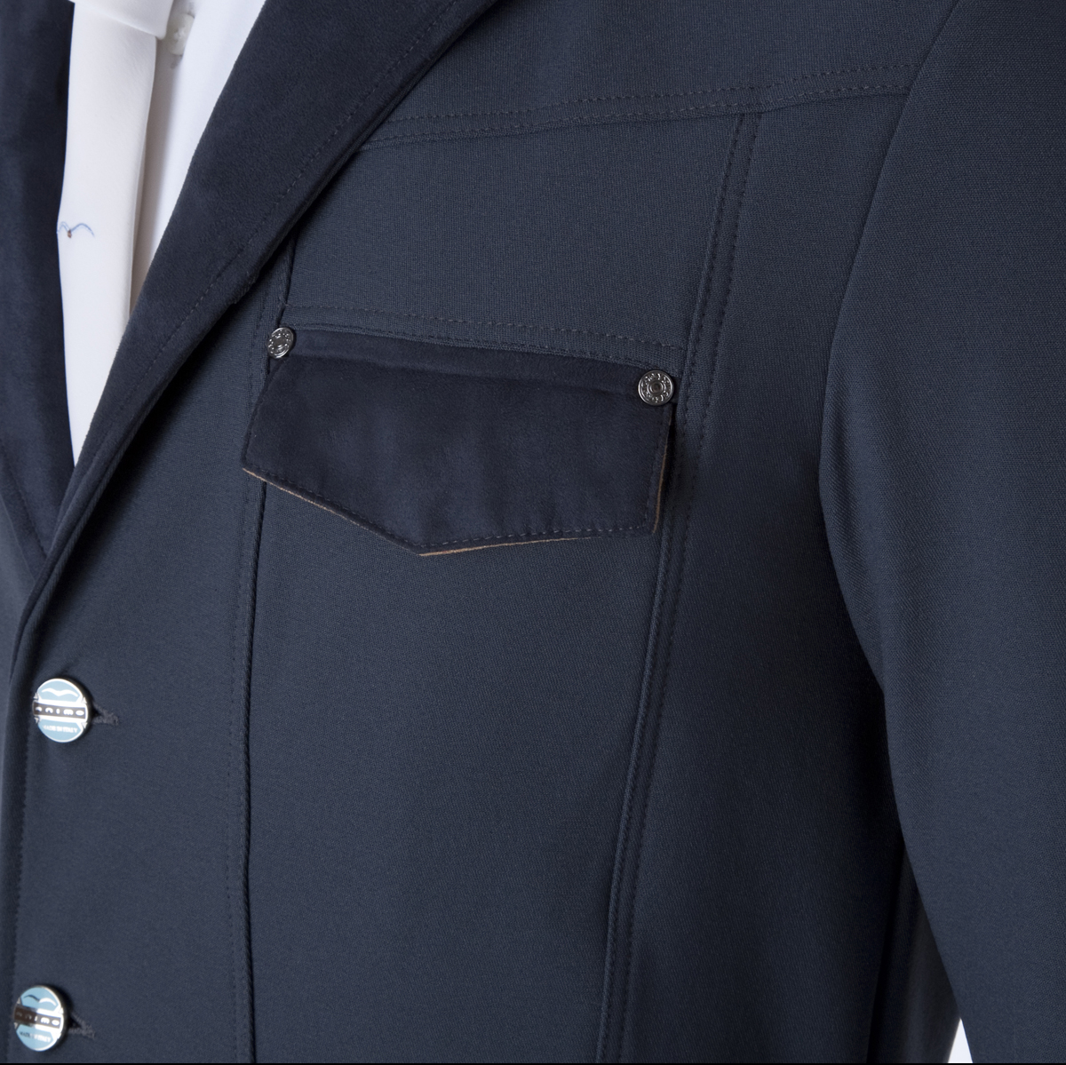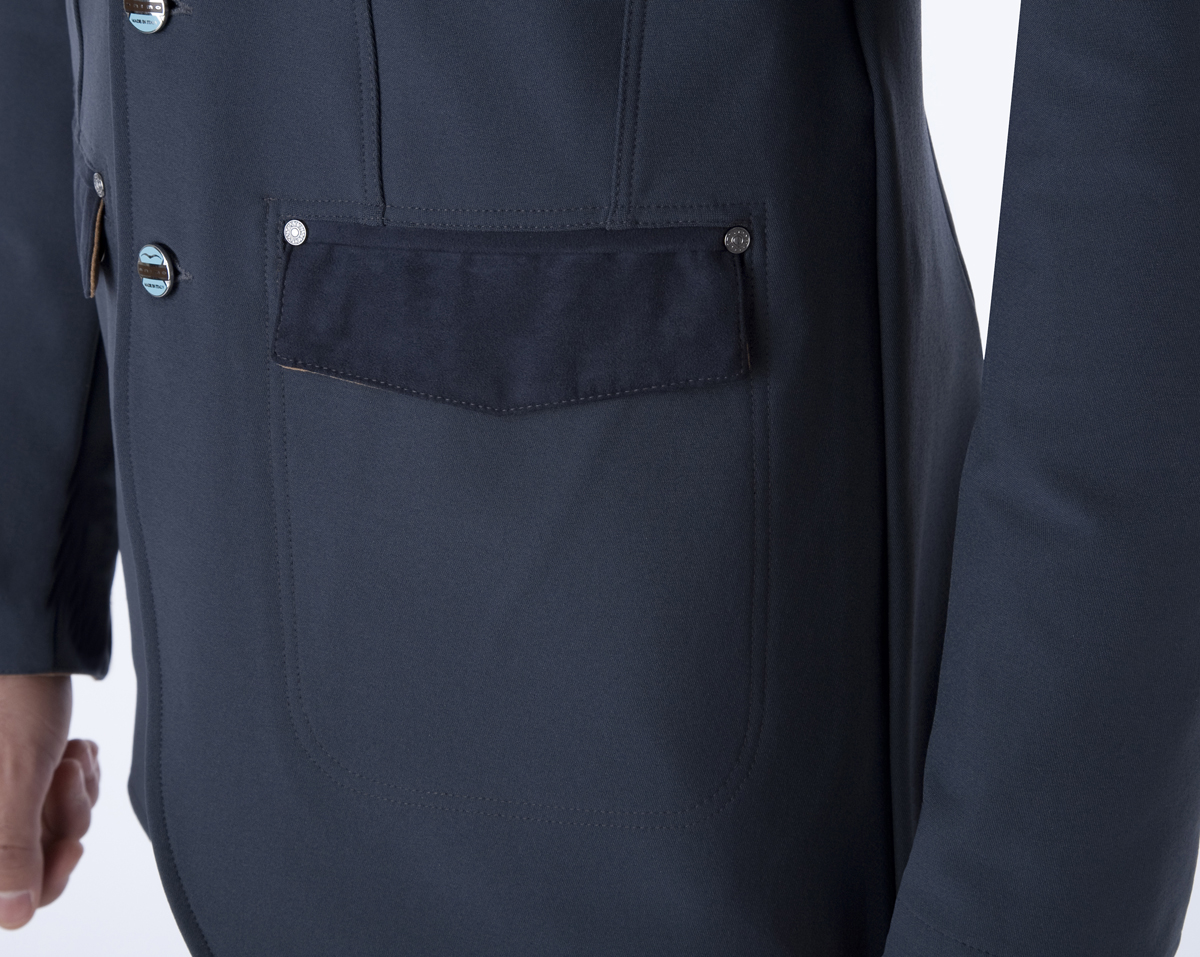 Zwei Klapptaschen, die Brusttasche und Kragen in Alcantara-Optik.
