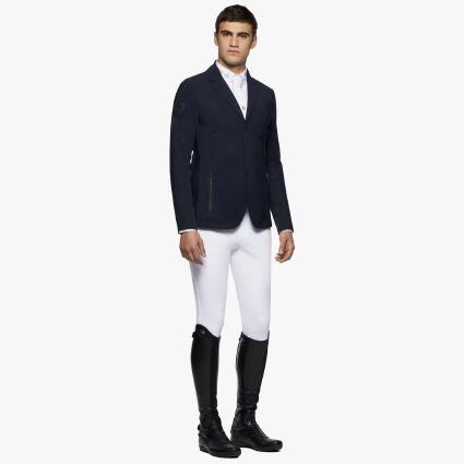 Diese Herren-Reitjacke besteht aus leichtem, hoch atmungsaktivem technischem Material, ideal für Sommertage. Das wasserabweisende Gewebe vereint Eleganz und Leistung dank antibakteriellem und UV-Schutz. Es passt sich Ihren Bewegungen an und folgt Ihren Bewegungen, ohne einzuengen. Die klassisch geschnittene Jacke wird mit drei vorderen Knöpfen geschlossen und verfügt über zwei Fronttaschen und eine Brusttasche. Es wird durch einen Alcantara-Kragen und kontrastierende Paspeln verfeinert.