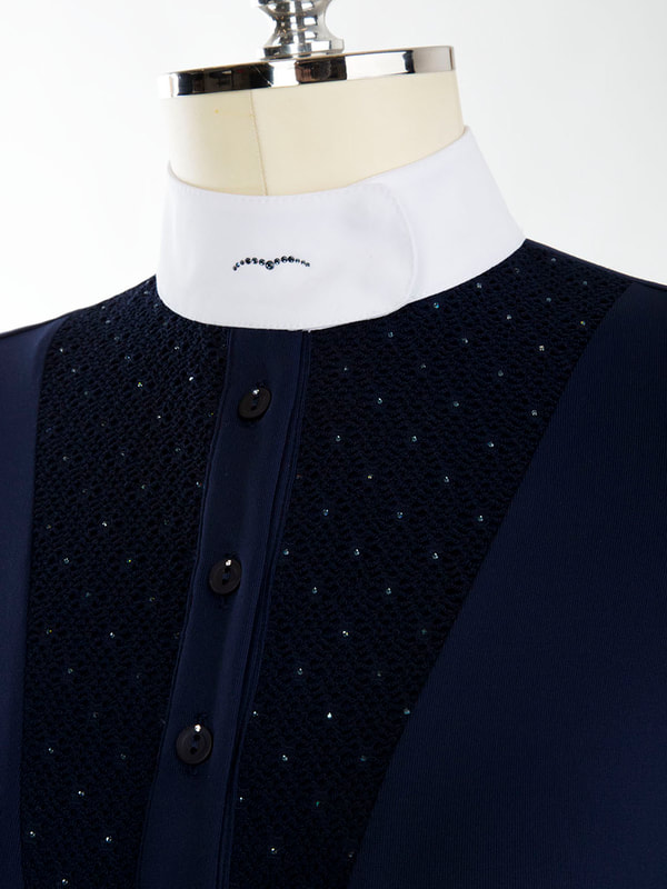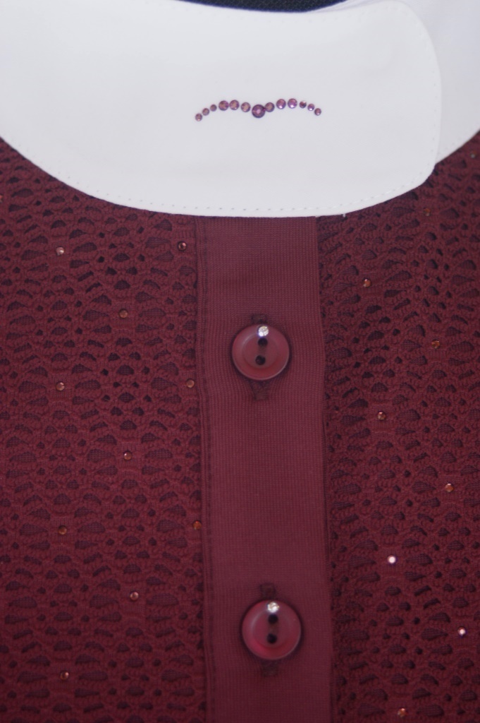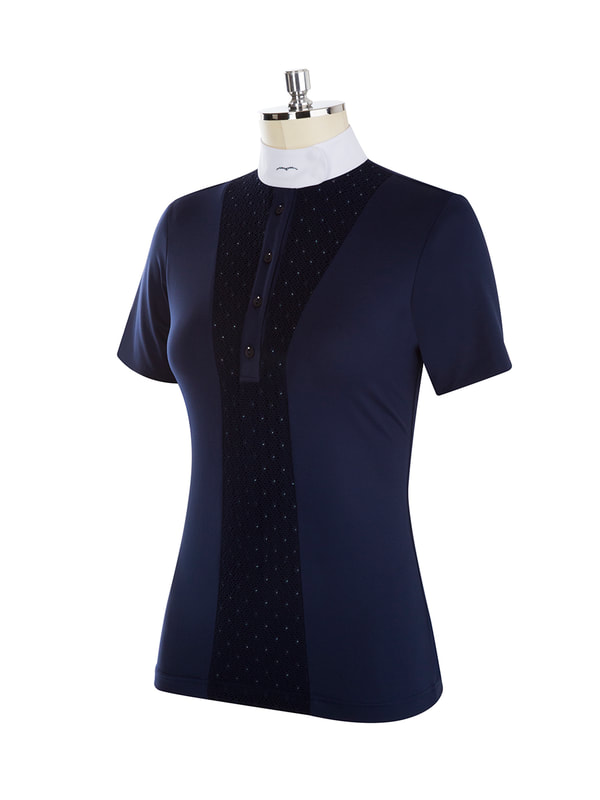 Kurzarm Reitshirt mit elastischem Spitzeneinsatz im Frontbereich, der mit kleinen Strass-Steinchen in der Grundfarbe des Shirts verziert ist.