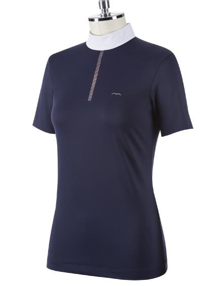 ANIMO Damen Reitshirt mit kurzem Arm. Vorne mittig schöne Verzierung mit kleinen Glitzersteinchen in hellblau und kupferrosé.