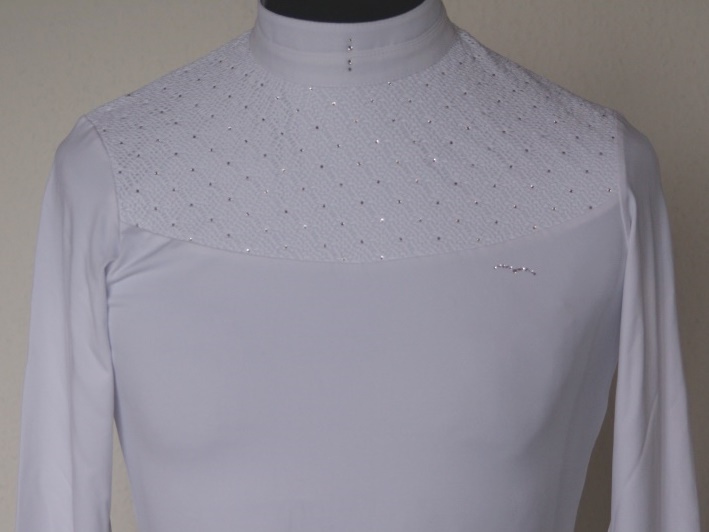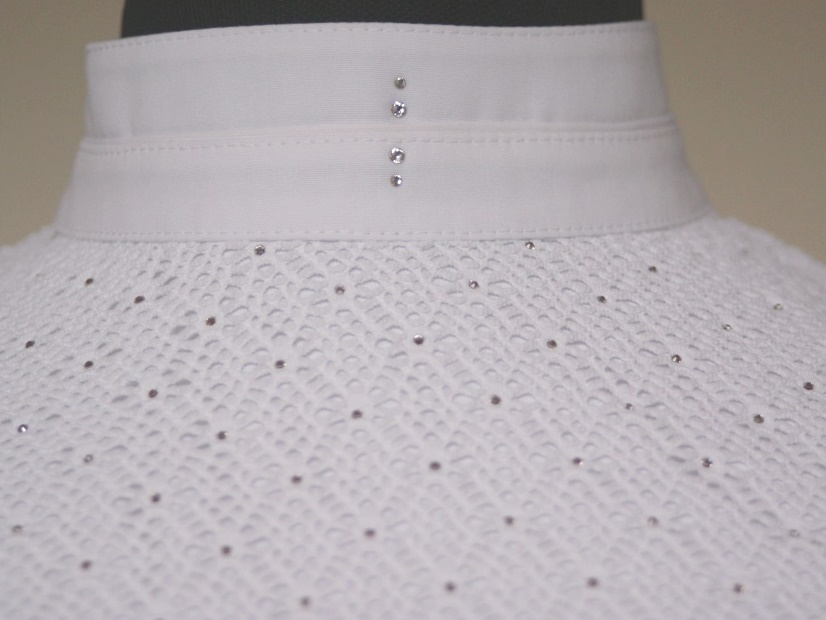 Elegantes ANIMO Damen Langarm Reitshirt mit elastischem Spitzeneinsatz im oberen Brustbereich, der mit kleinen Swarowski-Steinchen verziert ist.