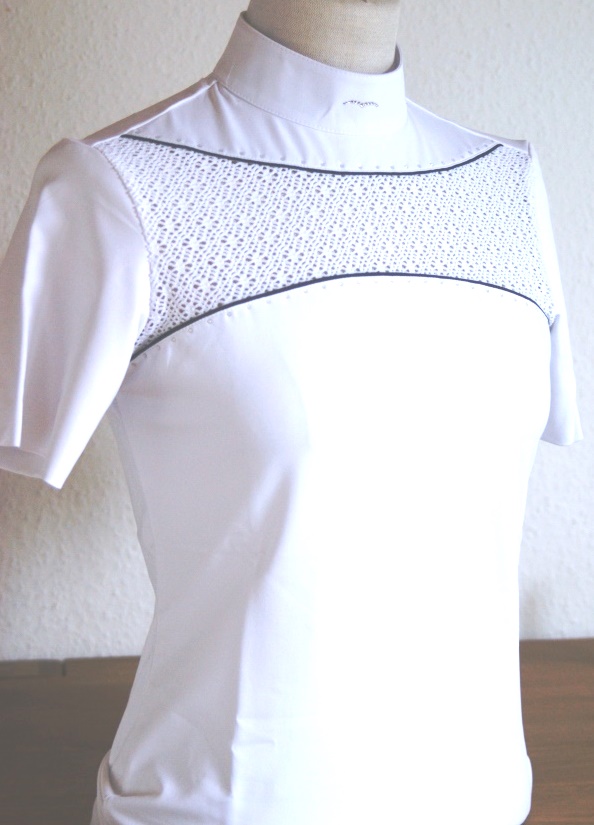 Kurzarm Reitshirt mit symmetrischem, elastischem Spitzeneinsatz im Frontbereich. Verzierung mit blauer Biese und einer Reihe Strass-Steinchen.