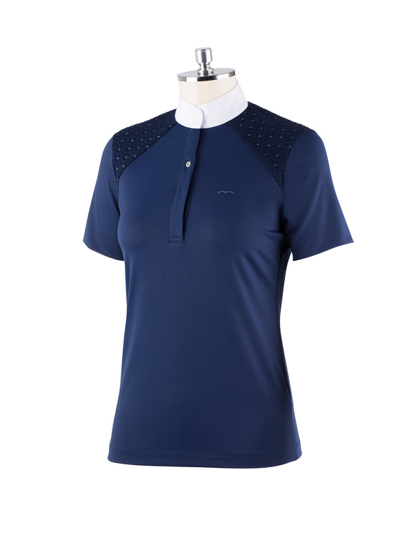 ANIMO Damen Reitshirt mit kurzer Knopfleiste mit verdeckten Druckknöpfen und einem Perlmuttknopf vorn.