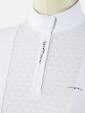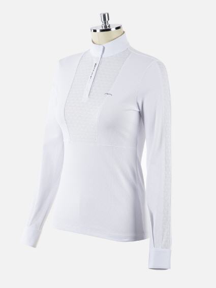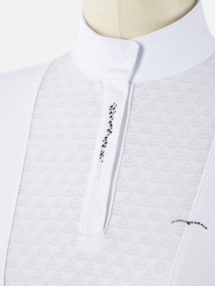Erleben Sie das Brulla Women's Long-Sleeve Competition Polo von ANIMO, eine perfekte Mischung aus klassischem Design und moderner Performance. Dieses Poloshirt verfügt über einen Einsatz aus weißem Jacquardstoff auf der Vorderseite und an den Ärmeln mit verdeckten Knöpfen, die mit Strasssteinen verziert sind.