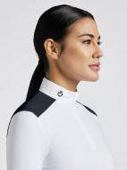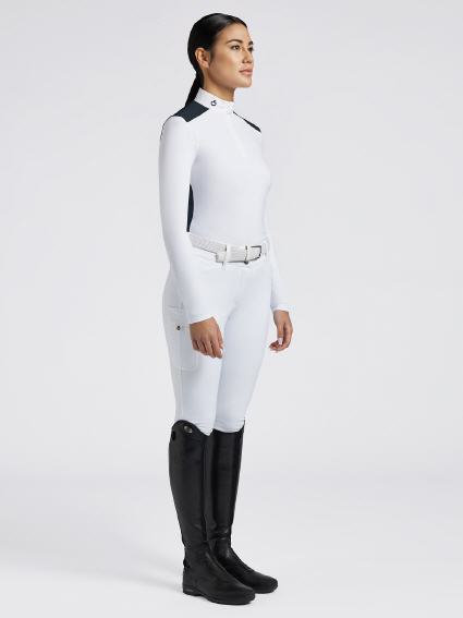 Das Cavalleria Toscana Reitshirt für Damen verkörpert Eleganz und technische Leistung und wurde für anspruchsvolle Reiterinnen entwickelt, die hochwertige Bekleidung verlangen. Dieses Hemd aus hochwertigem technischem Jersey ist für seine Strapazierfähigkeit und Atmungsaktivität bekannt und sorgt auch bei den intensivsten Wettkämpfen für hervorragenden Komfort. Das raffinierte Design zeichnet sich durch kontrastierende Einsätze auf der Vorder- und Rückseite aus, die für einen Hauch von Raffinesse und exklusivem Stil sorgen. Der weiße Kragen und der beschichtete Reißverschluss in der Mitte sind markante Details, die den Look des Kleidungsstücks aufwerten, während das gestickte CT-Logo auf dem Kragen das Engagement von Cavalleria Toscana für Exzellenz unterstreicht.