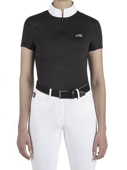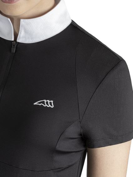 Atmungsaktives Damen Turniershirt von EQUILINE aus komfortablem Stretchmaterial. Der ergonomische Schnitt für perfekte Passform. Mit microperforierten Details, auch am Kragen. Frontreißverschluss und eleganter hoher Kragen. Schnell trocknend.
