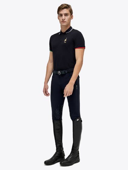 Dieses kurzärmelige Herren-Polo besteht aus weicher, atmungsaktiver Baumwolle, die den besten Komfort für Training oder Freizeitkleidung bietet. Veredelt wird es durch die italienische Flagge und das FISE-Logo auf der Brust und durch einen gestickten Schriftzug auf der Rückseite. Der Kragen wird durch drei kleine Knöpfe geschlossen. Das pflegeleichte Material lässt sich in der Maschine waschen und trocknet schnell, ideal für häufigen Gebrauch.