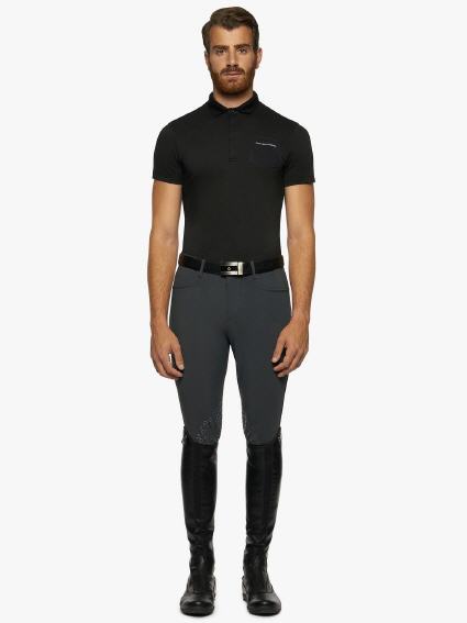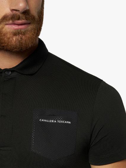 Sportliches Herren Freitzeit-Poloshirt von CAVALLERIA TOSCANA. Der atmungsaktive technische Stoff aus Piqué-Strick wurde für eine elegante, schmale Passform geschnitten, die an den Seiten mit Jersey-Einsätzen besetzt ist. Die Brusttasche aus perforiertem Stoff mit Cavalleria Toscana Schriftzug sorgt für das gewisse extra.