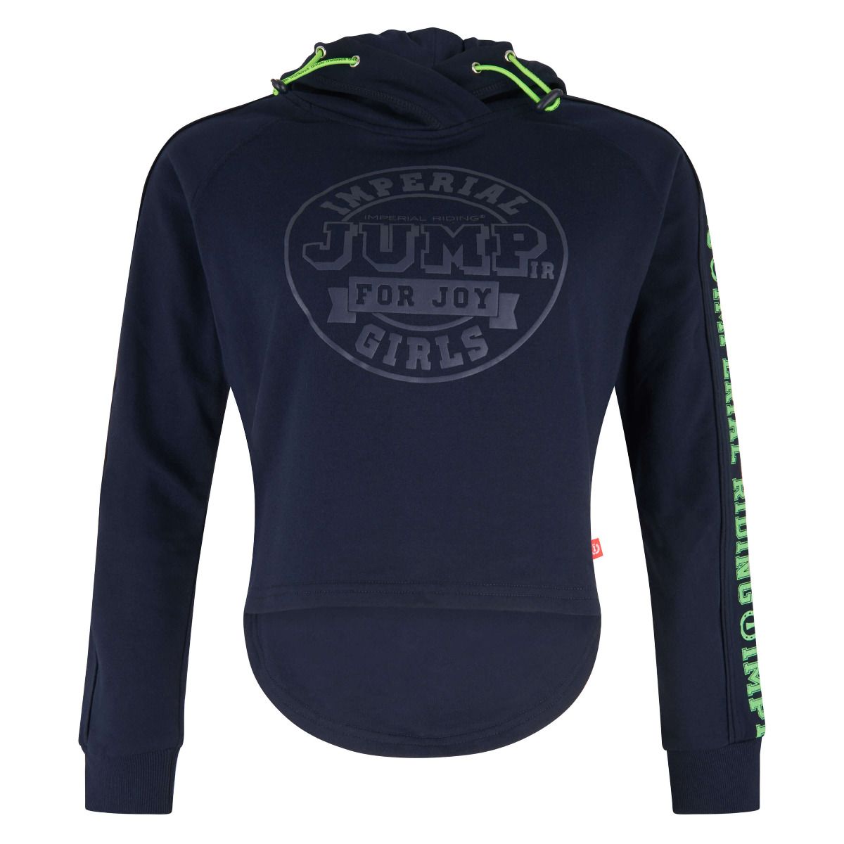 Sheen - reißverschluss- und taschenloser Premium 'Cropped' hoodie aus angenehm kuschligem Stoff. In seinen flashigen Farben macht der sportlich-lässige Kapuzenpullover auch außerhalb der Reitanlage Street Style-mäßig eine tolle Figur. Die Brust ziert ein großer Ton-in-Ton Print: „Imperial Girls - Jump for Joy“. Der fette „Imperial Riding“ Neon-Schriftzug mit Logo auf den Ärmelaußenseiten gibt diesem modischen Item noch einen zusätzlichen Schuss feminine Coolness. Die Kapuze lässt sich über ein hochwertiges Kapuzenband in Neonfarbe und mit Imperial Riding-Schriftzug einstellen. Besonders praktisch und zweckmäßig: Die zwei großen Kordelstopper am Tunnelzug. Der reißverschlusslose pull over-Hoodie hat einen leicht taillierten Schnitt. Ziernähte befinden sich an den Ärmelaußenseiten, den Schultern, am Kragen und der Kapuze. Der Saum des Kapuzen-Pullovers ist schmal abgenäht, an den Ärmeln sind mittelhohe, elastische Ripp-Bündchen angesetzt. Ein kleines rotes Logo-Fähnchen ist unten an der linken Seitennaht vernäht.