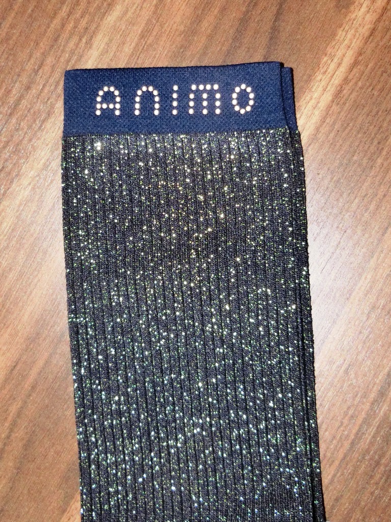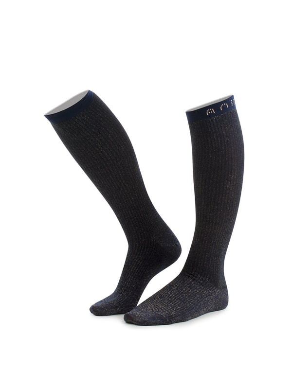 Damen Reitstrümpfe von ANIMO mit goldenen Lurexfäden und Ripstruktur.