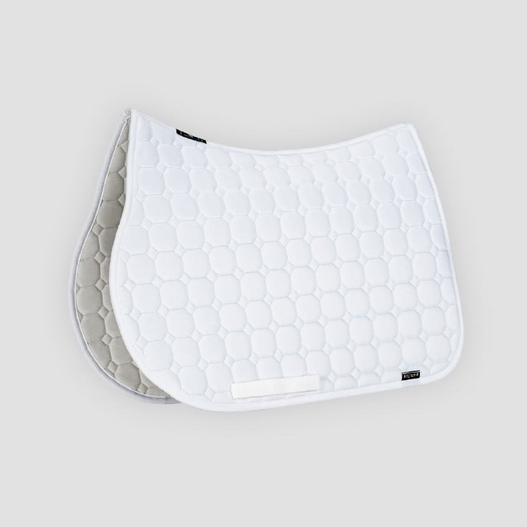 Die Innen- und Außenseite dieser Schabracke besteht aus einem Baumwollmischgewebe, das auf der Innenseite naturfarben ist, um zu vermeiden, dass der Rücken des Pferdes mit den Farbstoffen in Berührung kommt. Alle Gewebe, die Verwendung finden, sind antibakteriell und antiallergisch. Die Wattierung besteht aus reiner atmungsaktiver Watte mit 900g. Dank des Systems ACS2 mit Shock Absorber garantiert Octagon ein Maximum an Atmungsaktivität und gute Aufprall-Absorption. Einfassungen und Kordeln können individuell gestaltet werden.