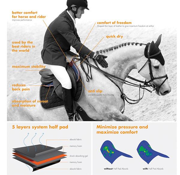 Dank seines 5-lagigen Systems ist das Sattelpad Absorb perfekt, um den Druck des Sattels gleichmäßig zu verteilen und zu minimieren sowie die belastende Einwirkung des Reiters zu absorbieren. Es bietet optimale Komfort für Reiter und Pferd.