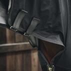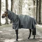 Der Regendecke für Pferde ist ein Muss für jeden Turnierreiter, um sein Pferd und sein wertvolles Sattelzeug gegen starken Regen zu schützen. Sie ist kompakt, leicht und 100% wasserdicht. Auch ist sie leicht über andere Decken oder Sättel zu legen, wenn man ein Pferd bei Regen führt. Das Material aus 100% Polyester mit PU-Beschichtung auf der Außenseite garantiert, dass Ihre Decke 100% wasserdicht ist. Vorne befindet sich ein kleiner Klettverschluss, um das Halsteil am Halfter oder Zaumzeug zu befestigen. Klettverschlüsse am Hals, ein einziger Verschluss vorne, ein Gurt und eine Schweifkordel helfen, die Decke an ihrem Platz zu halten. Die Decke ist bei 30° in der Maschine waschbar, kein Trockner.